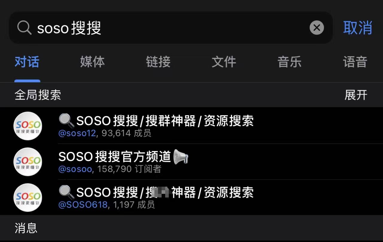- 在 Telegram 搜索栏输入关键词“soso 搜搜”,即可找到搜群工具。